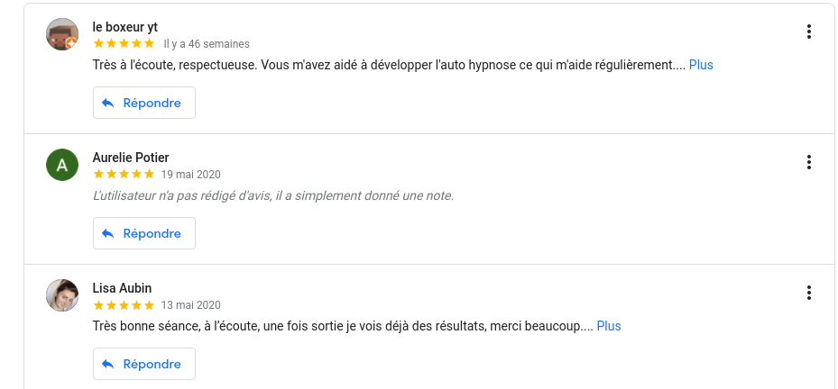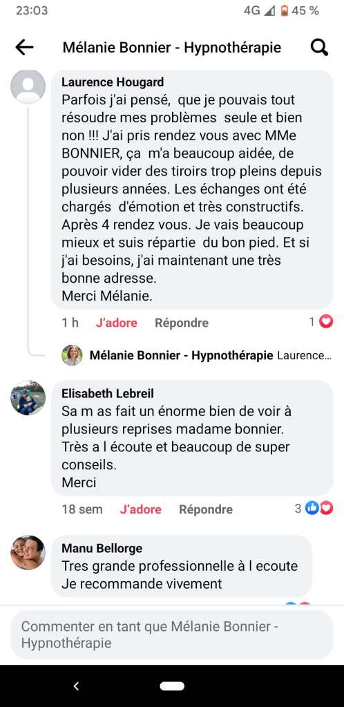 Parce qu’il est toujours difficile de choisir un thérapeute, voici ci-dessous des avis reçu de personnes que j’ai accompagnées que vous pourrez retrouver sur google ou Facebook.